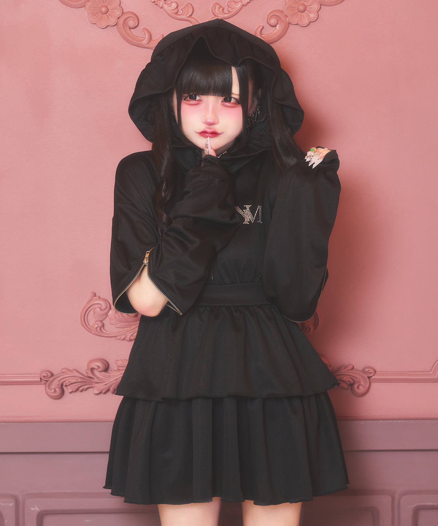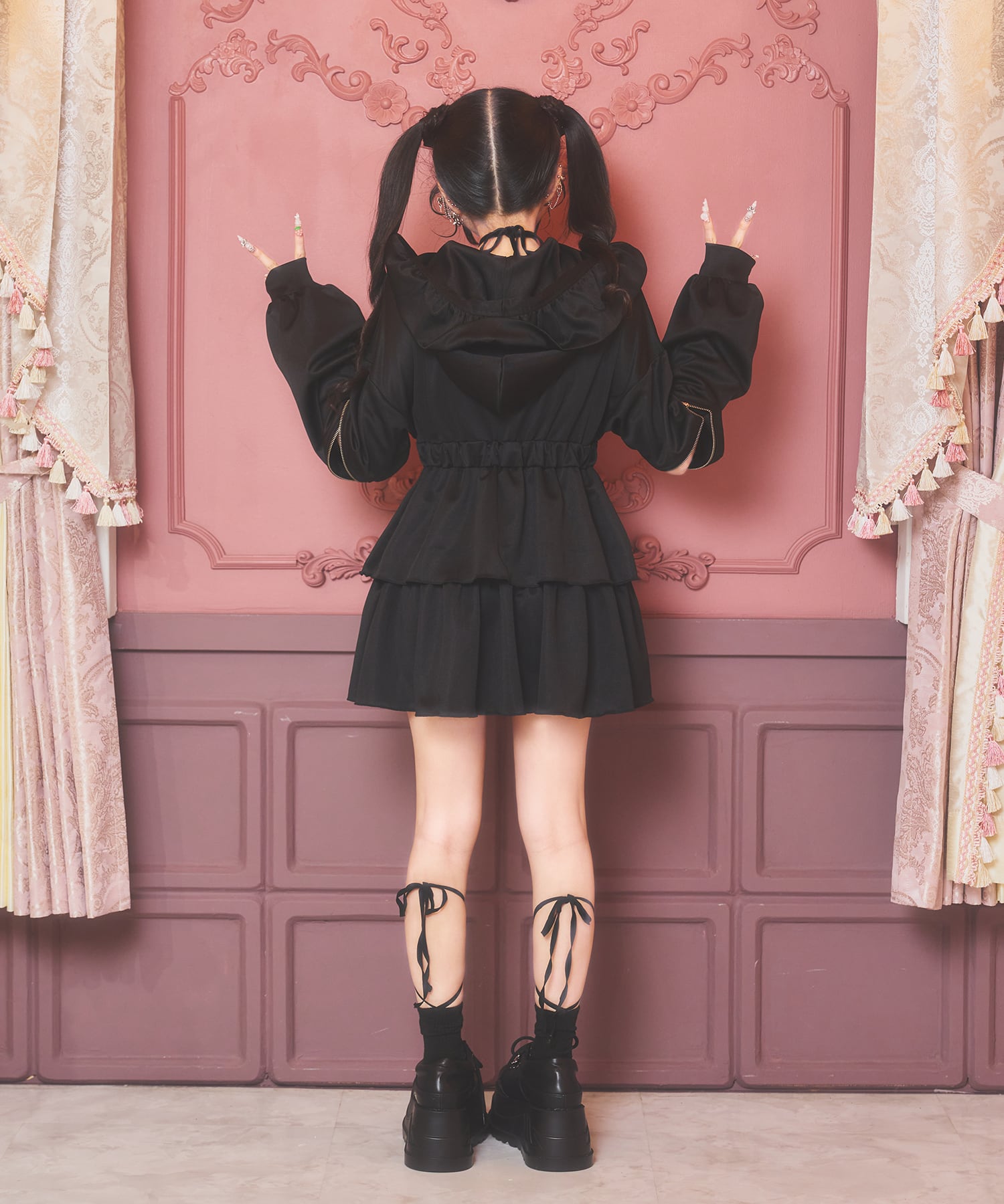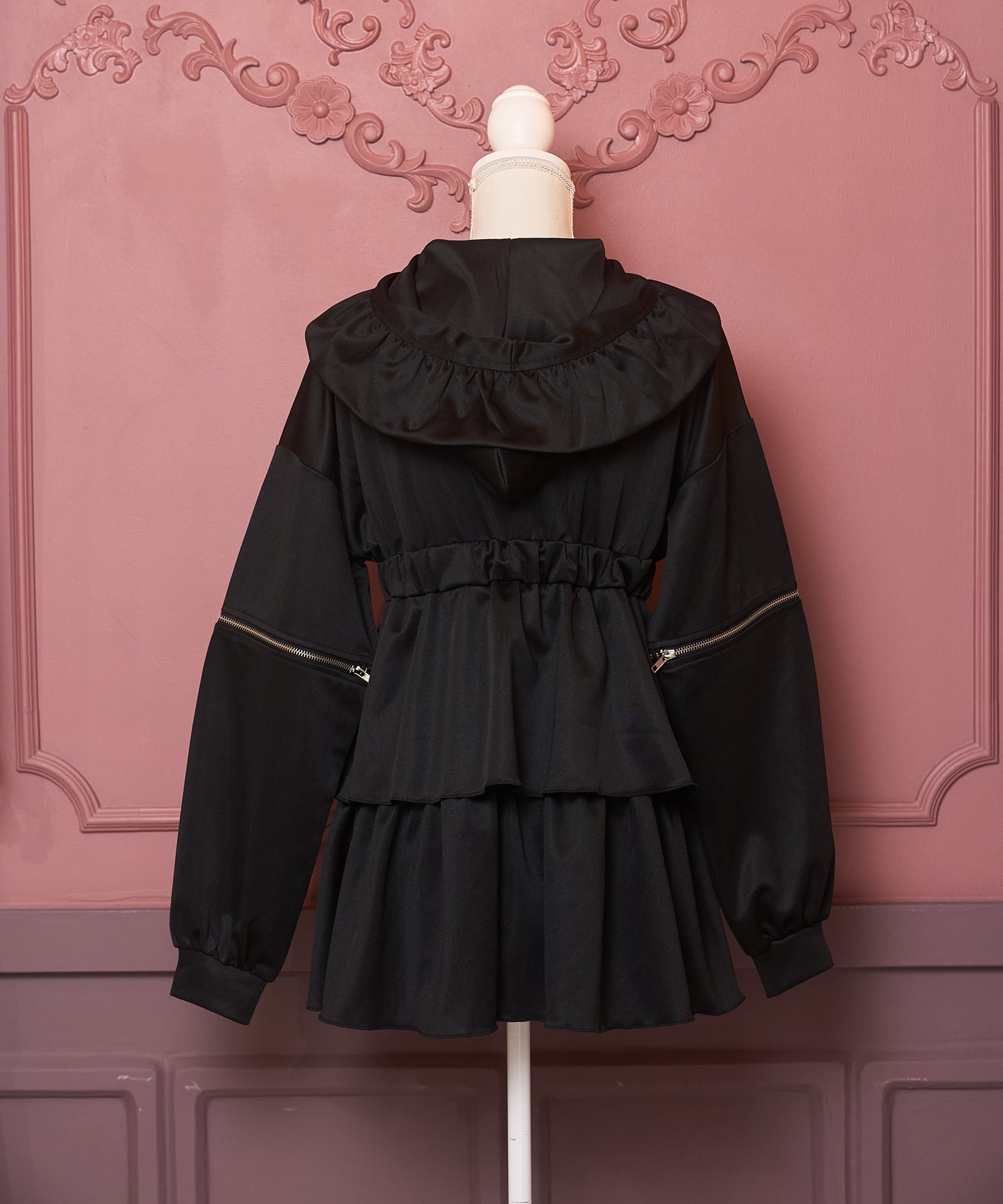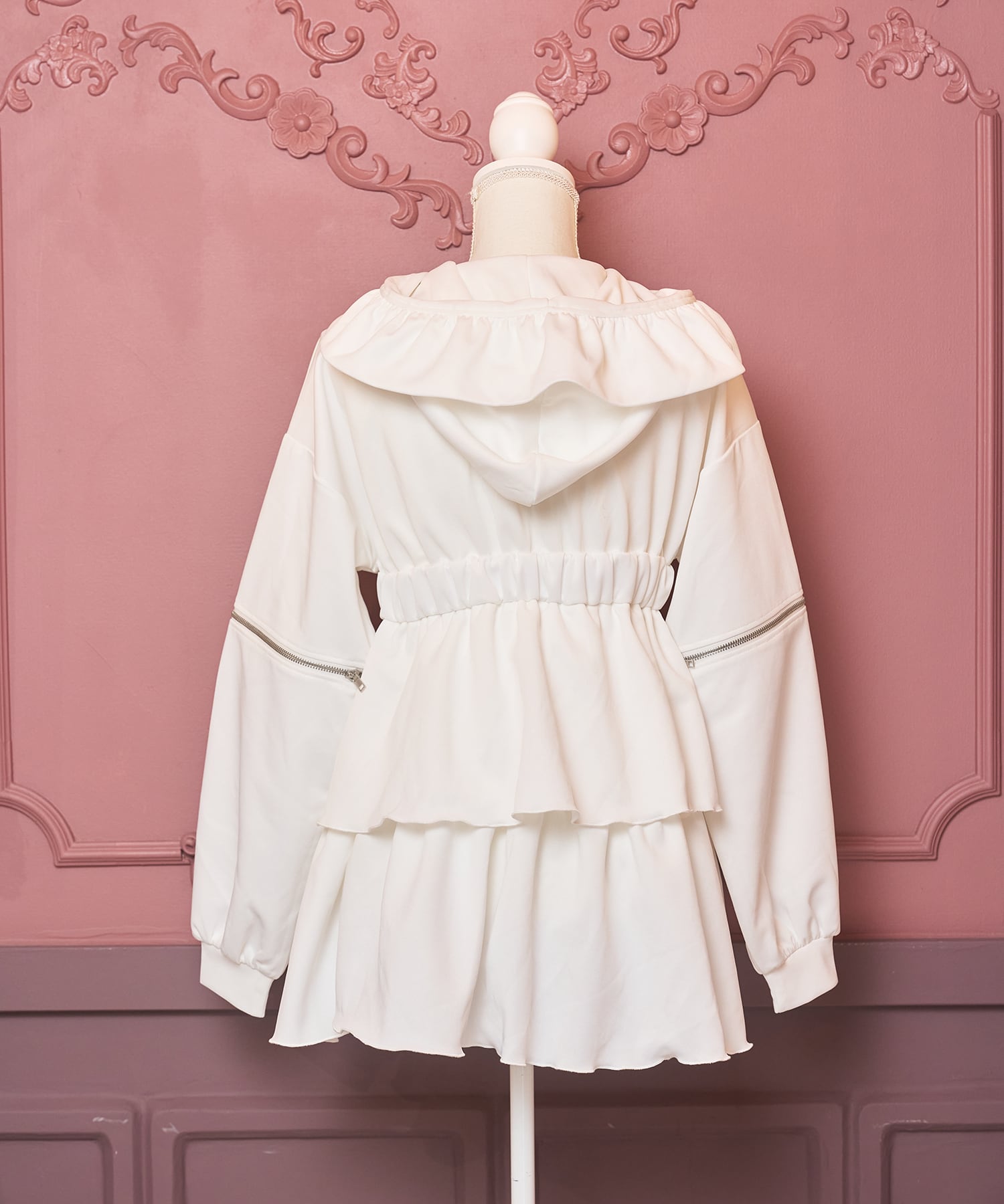 赤ちゃんみたいなフリフリ付きフードと、開けたり閉めたりいろんな着こなしができる袖のZIPがポイントです。