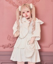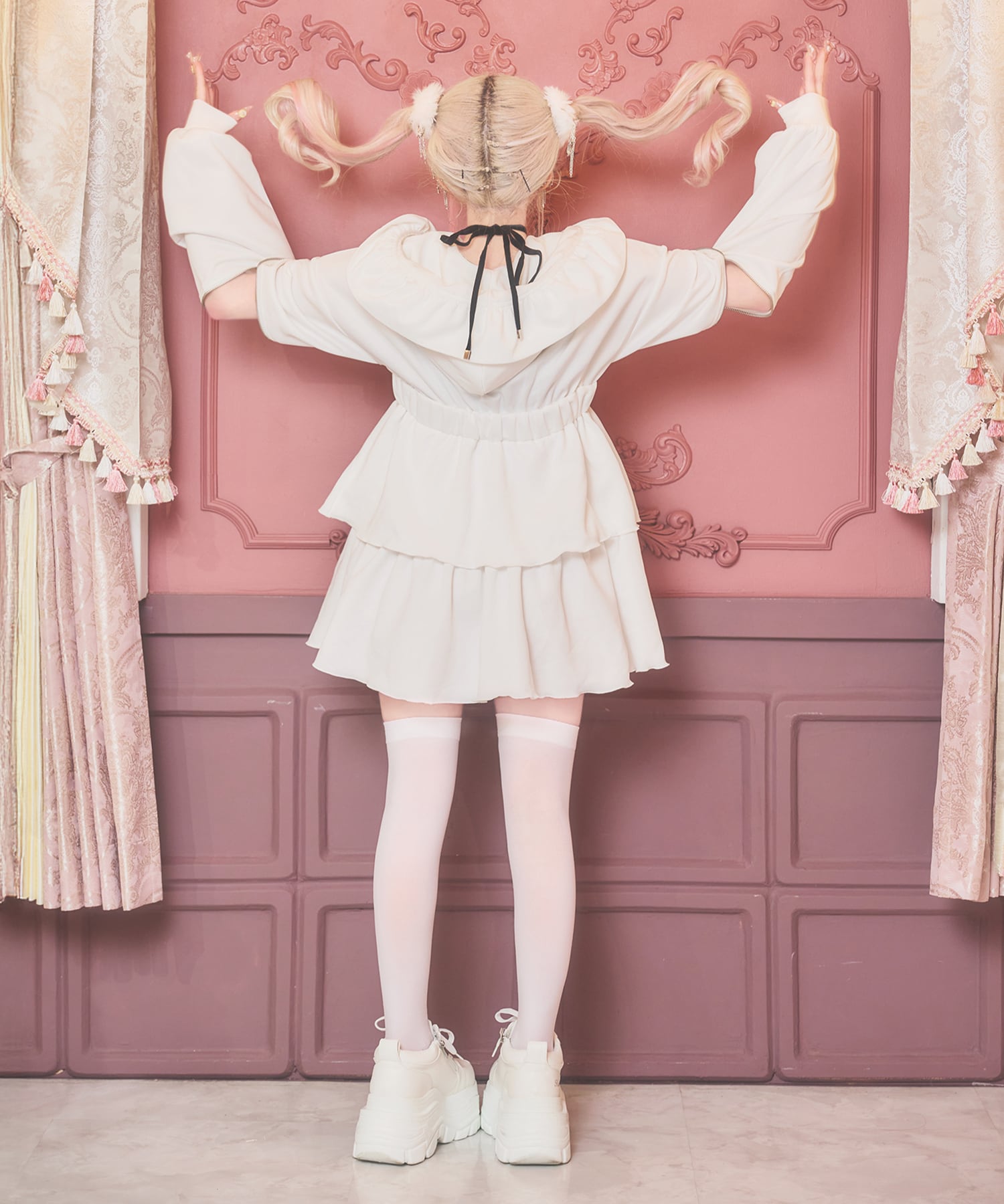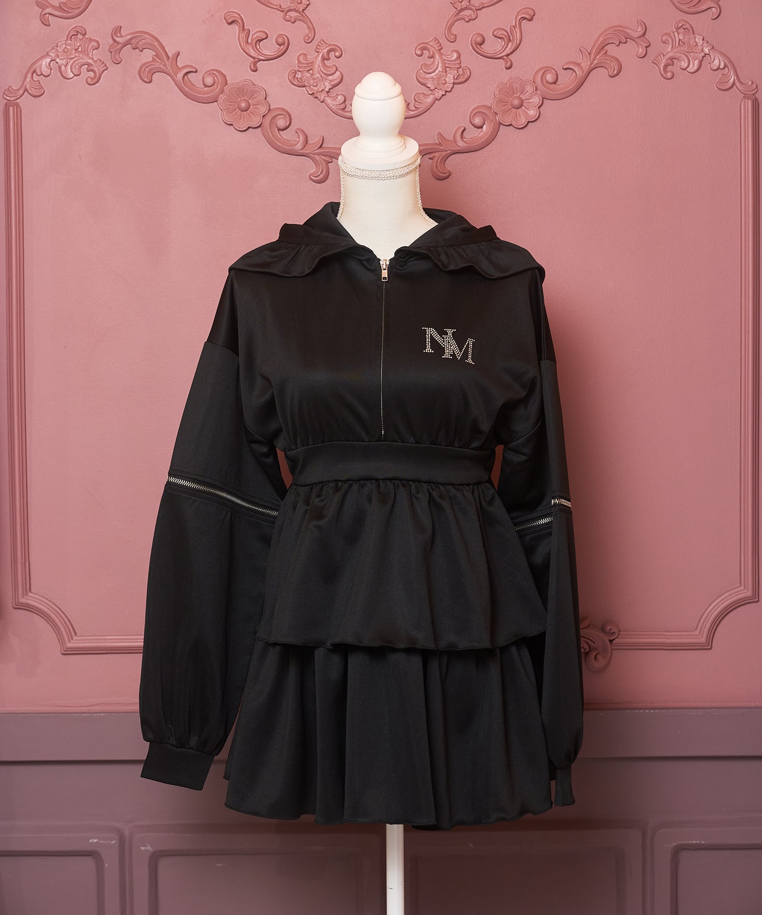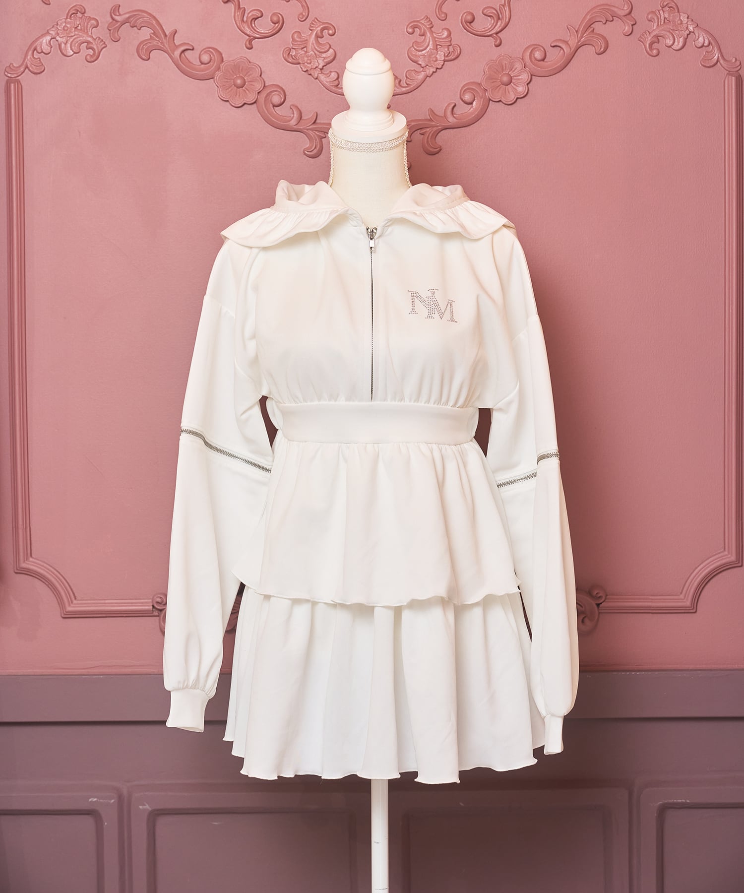赤ちゃんみたいなフリフリ付きフードと、開けたり閉めたりいろんな着こなしができる袖のZIPがポイントです。