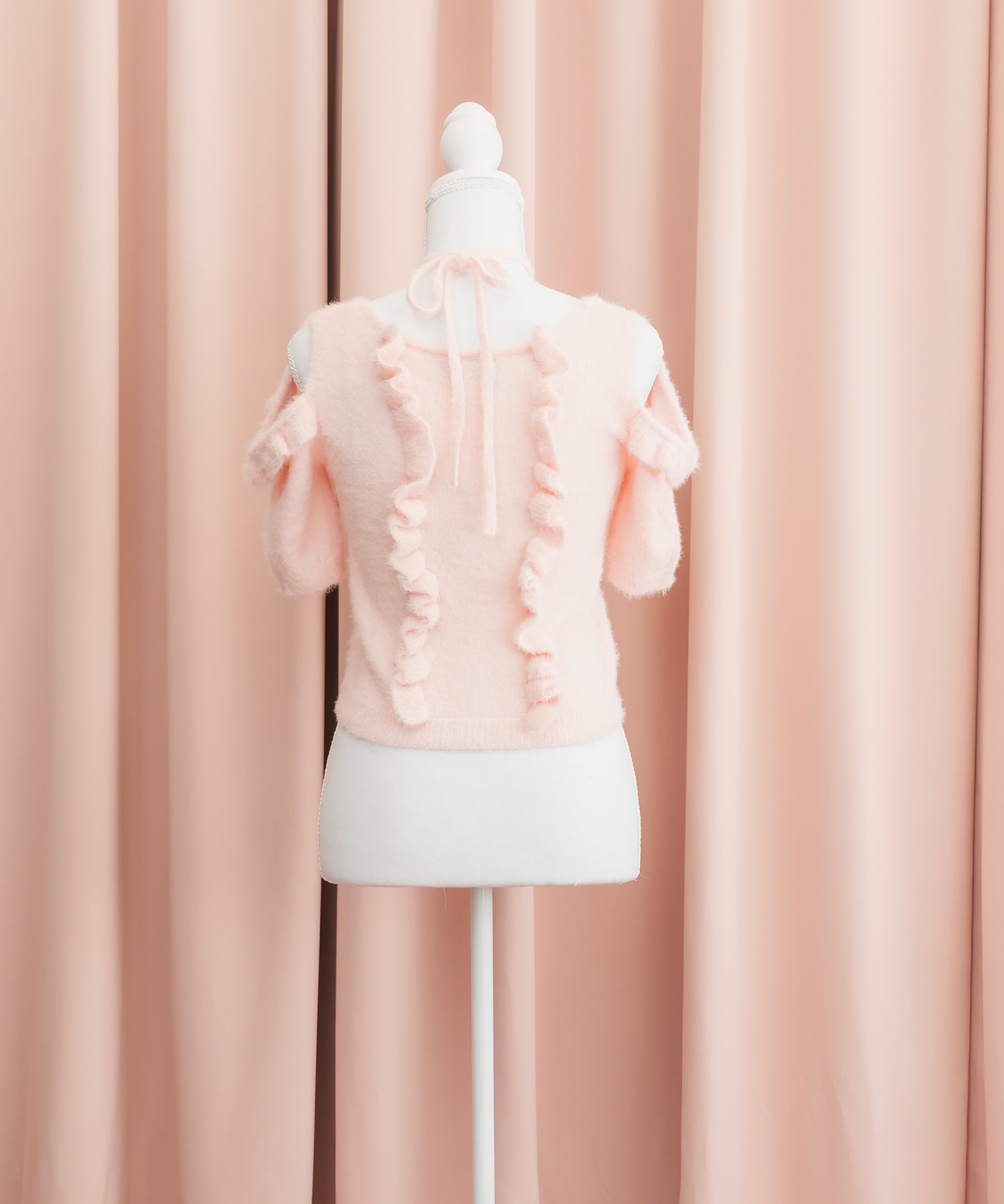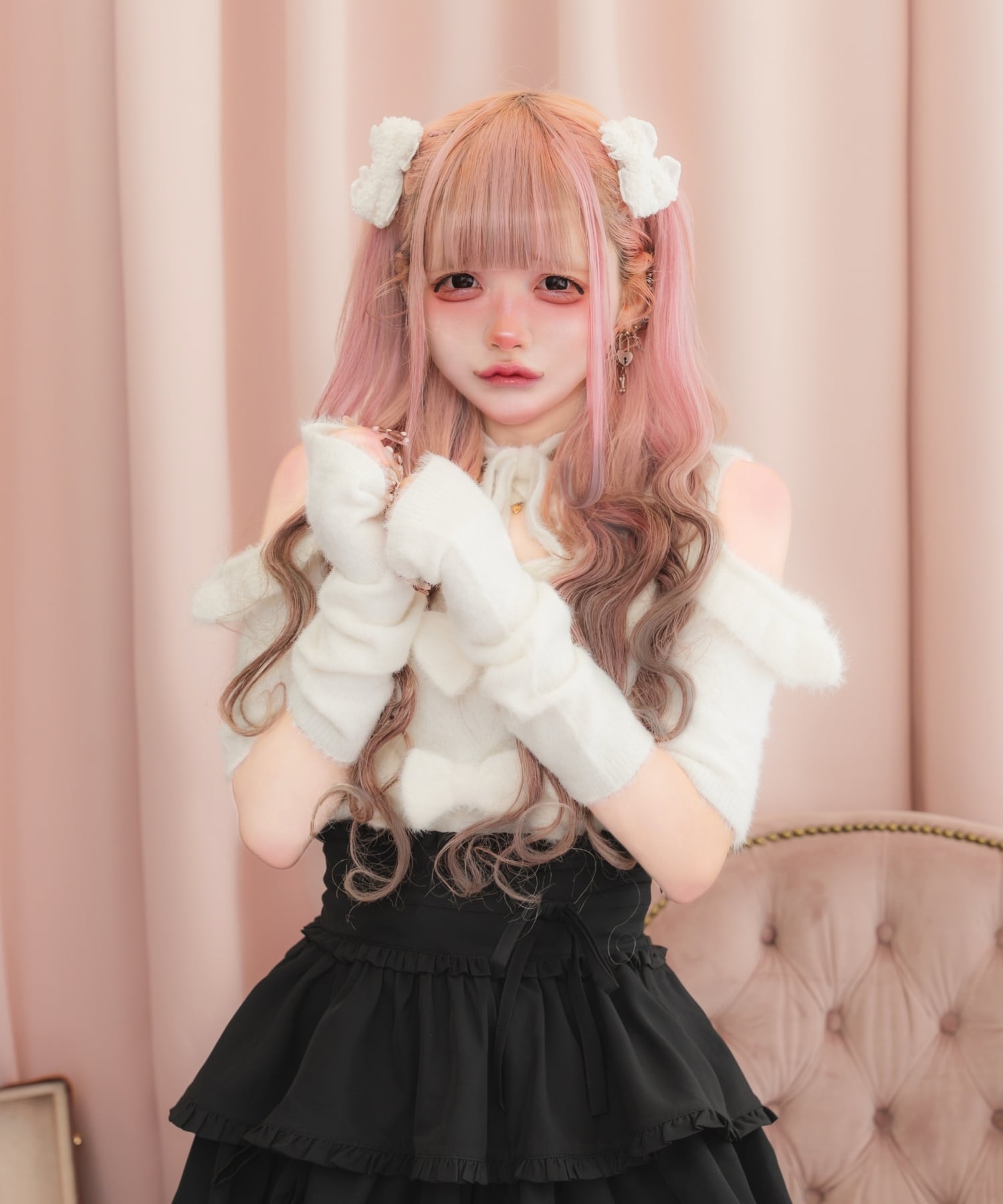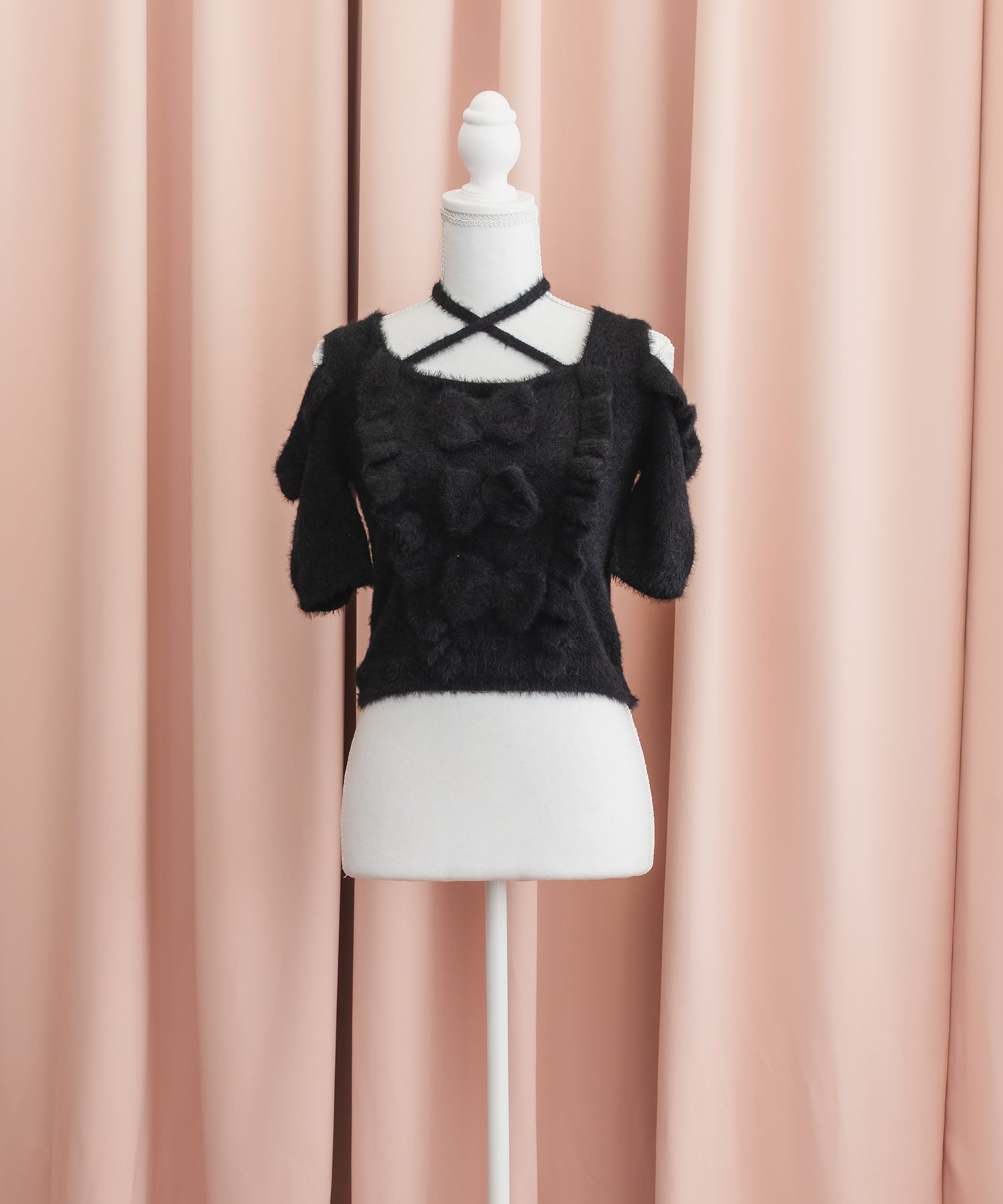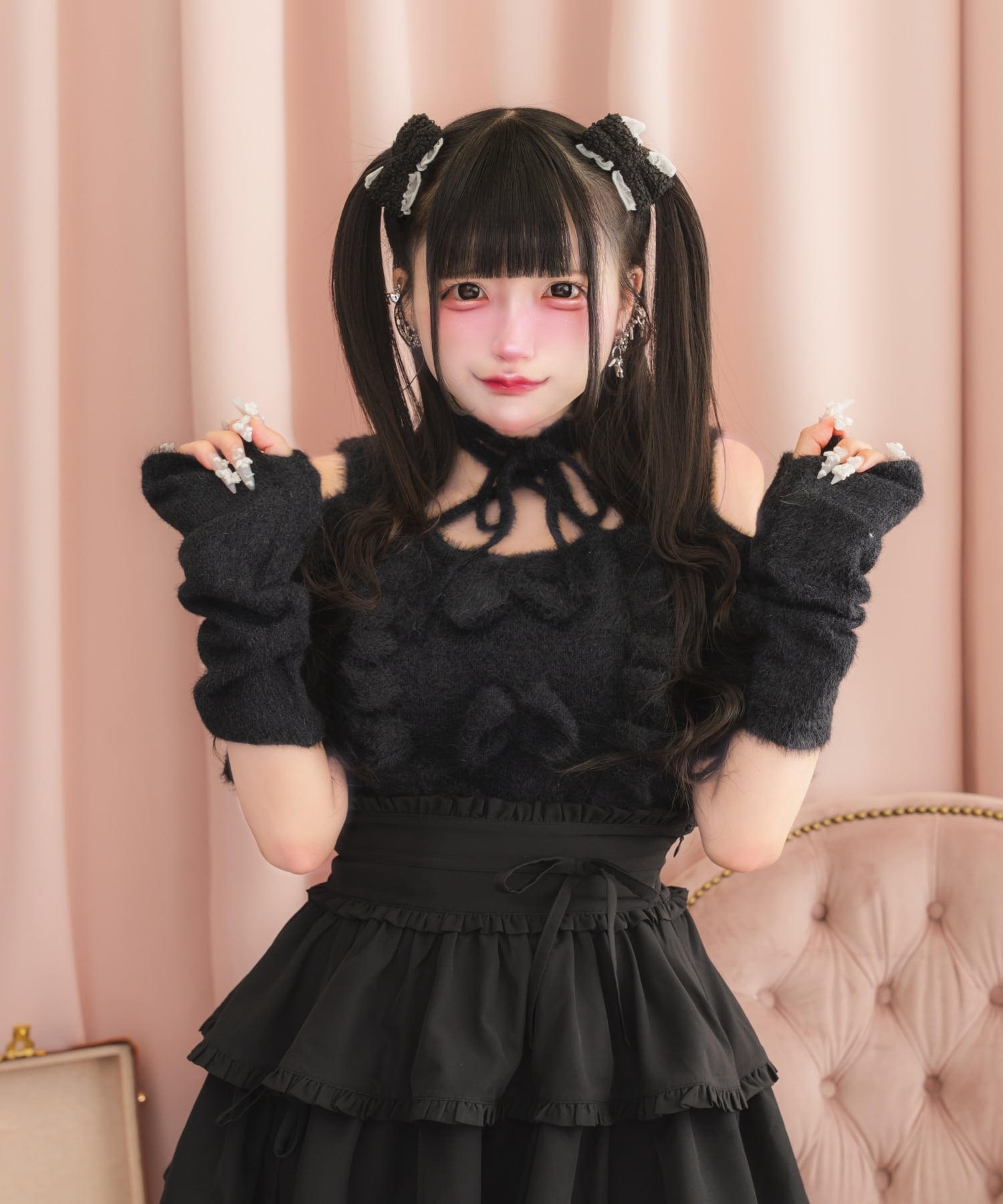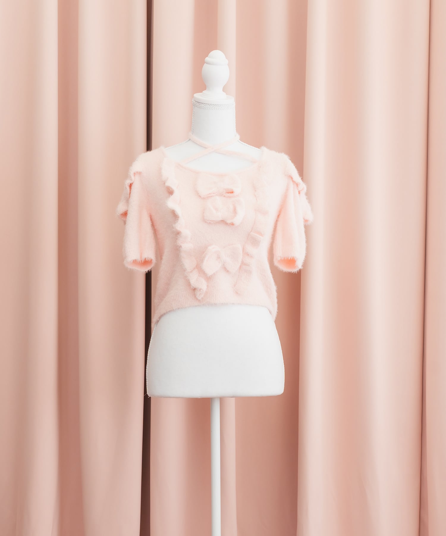 リボンとフリルのディテールがかわいい、アームカバー付きニットトップス♡